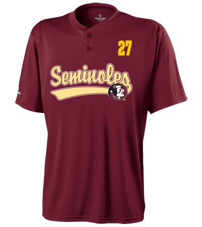 Design your Florida State Baseball Jerseys at CustomPlanet.com. Use our athletic fonts to add names and numbers. Your team can look like the Seminoles college players do! This jersey is made from Dry-Excel™ fresh micro-interlock polyester. Semi fitted performance product with wicking and Odor Resistant properties. Two-button placet and matching, self-fabric collar. Decorated with college replica logos for youth team sports. Team Sales Only! "