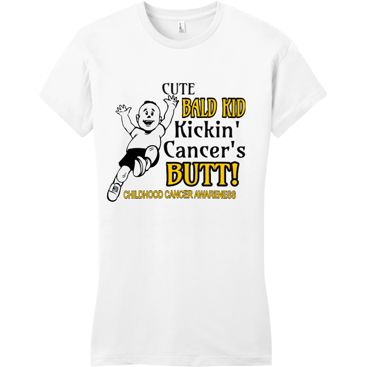 Buy screen printed Bald Kid Kickin' Cute Cancer's Butt! Childhood Cancer Awareness - Cancer Awareness T-shirt Design Cancer Awareness T-Shirts Online. Printed Cancer Awareness T-Shirts are a great way to unite your team and/or bring awareness to a great cause.