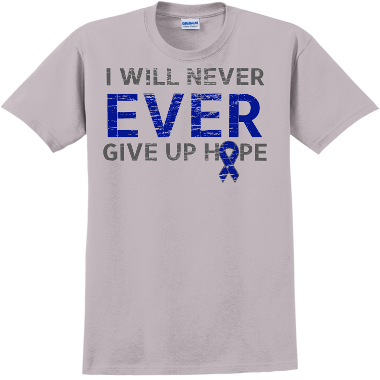 Design and order printed I Will Never Ever Give Up Hope - Cancer Awareness T-shirt Design Cancer Awareness T-Shirts Online. Custom printed Cancer Awareness T-Shirts are a great way to bring awareness to a great cause and/or unite your team.