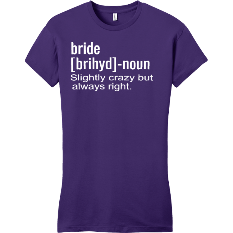 Design your own custom printed Bride-noun Slightly Crazy But Always Right. - Bachelorette Party T-shirt Design Bachelorette Party T-Shirts Online. Customized Bachelorette Party T-Shirts are a great way to create a memorable event and/or rep your tribe.