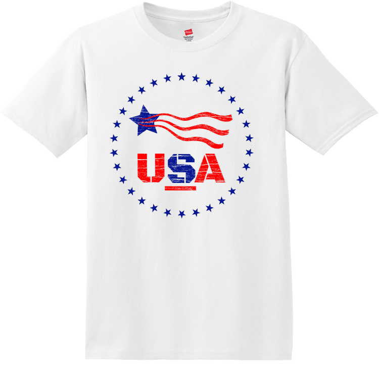 Order custom printed usa t shirts online. Screen printed T-Shirts are perfect for your 4th of July party or plain old your bbq bash. Best of all, when you order with Create A Shirt, you get access to 10,000+ clipart, pick your delivery date, and you can order just one. This Adult Men's T-Shirt is manufactured by Hanes, and is made with 100% Cotton.