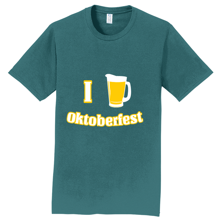 Create custom printed i love oktoberfest beer t-shirts online. Custom printed oktoberfest t-shirts are a fun way to rep your drinking team or remember the occasion. Best of all, when you order with Create A Shirt, you get to upload your logo, get help with artwork and before you place a big order, you can order a sample. This Adult Men's T-Shirt is manufactured by Port and Company, and is made with 100% 4.5-ounce Cotton. These shirts even have a removable tag for comfort and relabeling.