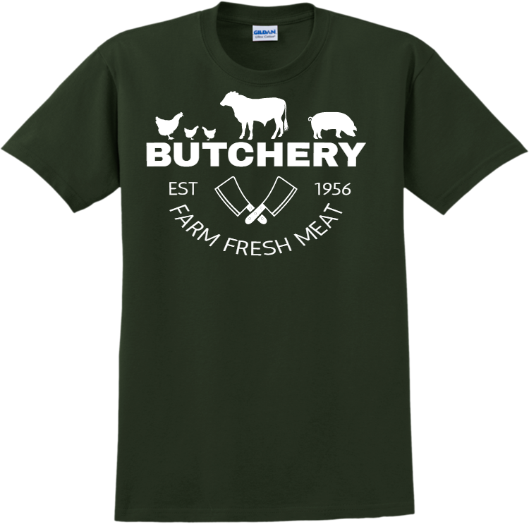 Buy printed Butchery Est Farm Fresh Meat - Butcher T-shirt Design Butcher T-Shirts Online. Screen printed Butcher T-Shirts are a great way to show off your business and grow your brand.