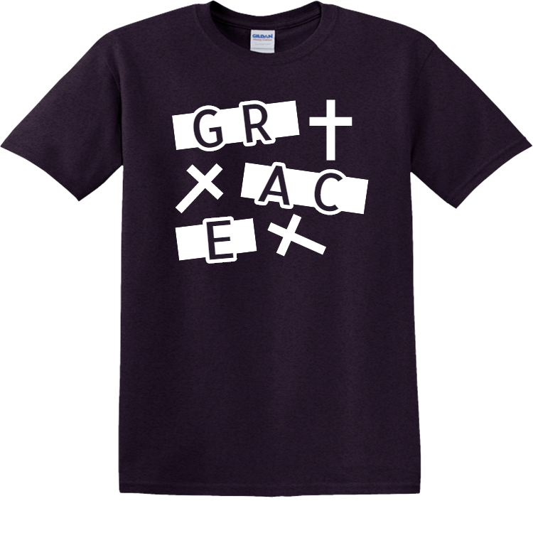 Order screen printed grace t-shirts online. Printed christian t-shirts are perfect for your youth group event or your bible camp. Best of all, when you order with Create A Shirt, you get an easy online designer, full visibility tracking, and there are no minimum orders. This t-shirts is manufactured by gildan, and made with 100% cotton.