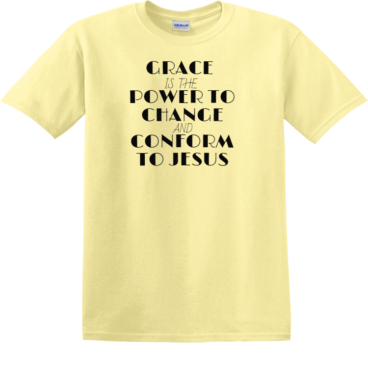 Order screen printed grace is the power to change and conform to jesus t-shirts online. Printed christian t-shirts are perfect for your youth group event or your bible camp. Best of all, when you order with Create A Shirt, you get an easy online designer, full visibility tracking, and there are no minimum orders. This t-shirts is manufactured by gildan, and made with 100% cotton.