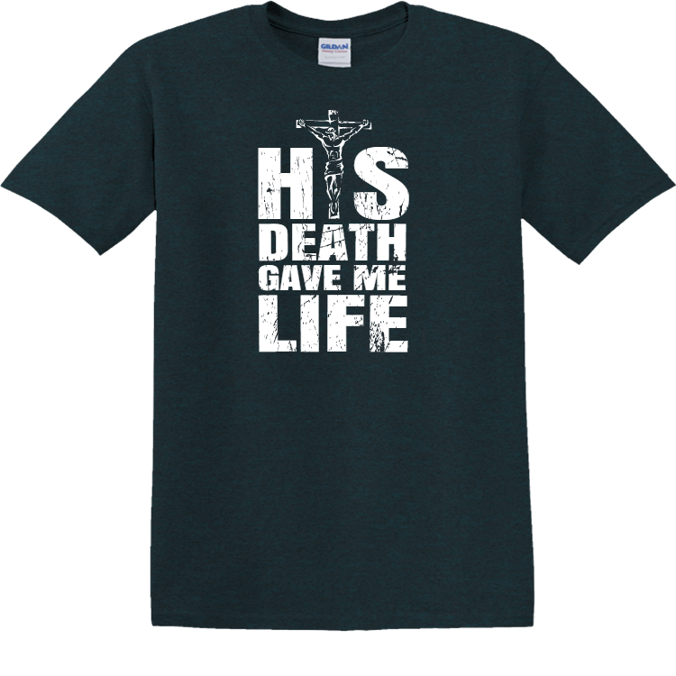 Design and order screen printed His Death Gave Me Life - Christian T-shirt Design Christian T-Shirts Online. Custom printed Christian T-Shirts are perfect for outreach ministry or your bible camp.
