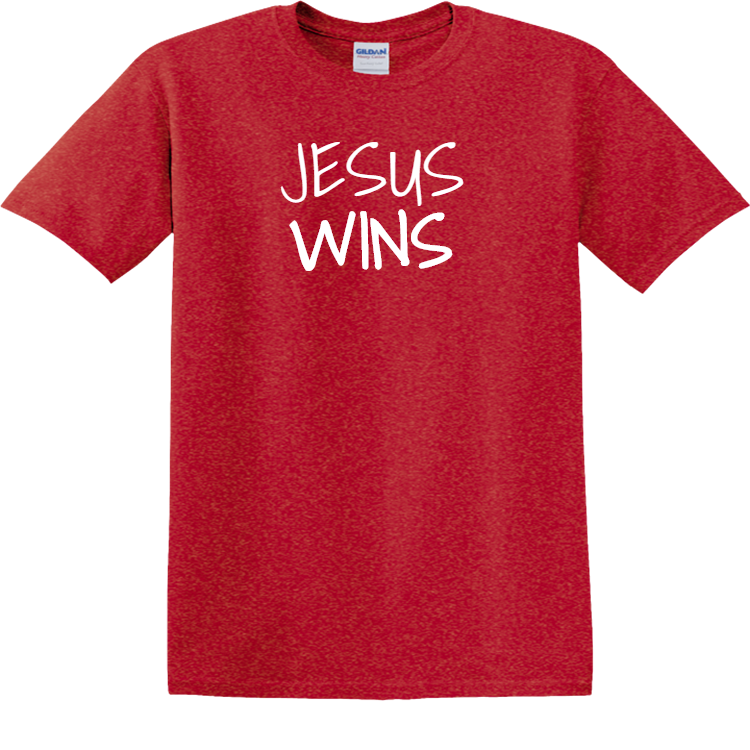 Order screen printed jesus wins t-shirts online. Printed christian t-shirts are perfect for your youth group event or your bible camp. Best of all, when you order with Create A Shirt, you get an easy online designer, full visibility tracking, and there are no minimum orders. This t-shirts is manufactured by gildan, and made with 100% cotton.