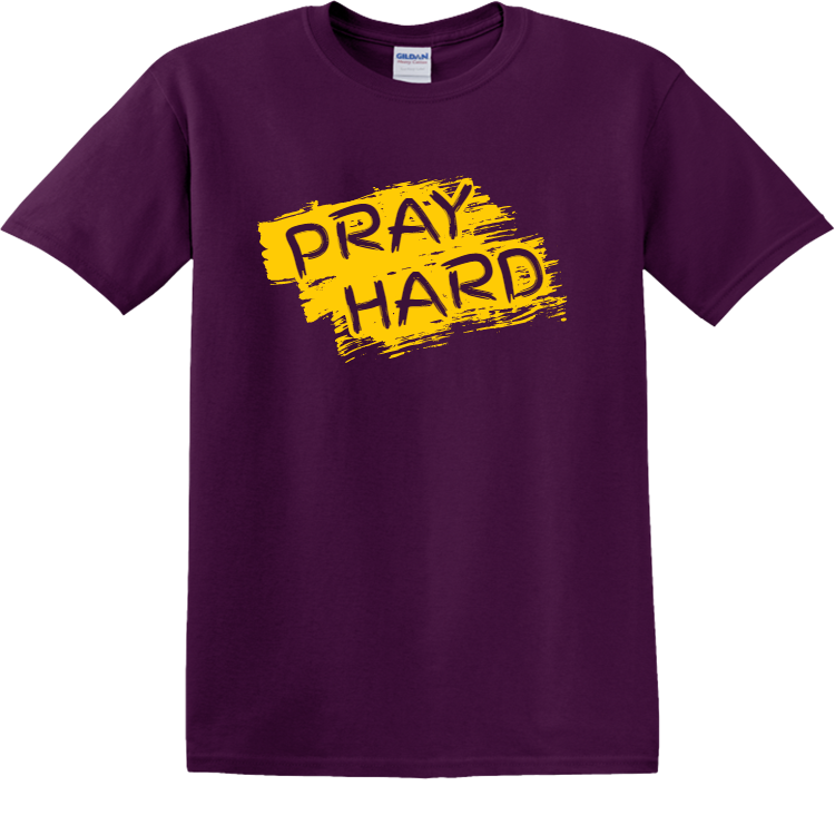 Order screen printed pray hard t-shirts online. Printed christian t-shirts are perfect for your youth group event or your bible camp. Best of all, when you order with Create A Shirt, you get an easy online designer, full visibility tracking, and there are no minimum orders. This t-shirts is manufactured by gildan, and made with 100% cotton.