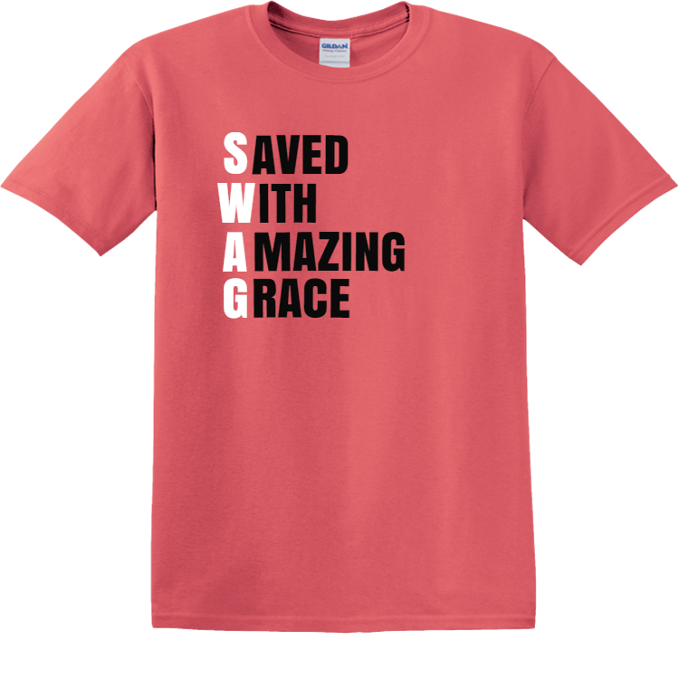 Order screen printed saved with amazing grace t-shirts online. Printed christian t-shirts are perfect for your youth group event or your bible camp. Best of all, when you order with Create A Shirt, you get an easy online designer, full visibility tracking, and there are no minimum orders. This t-shirts is manufactured by gildan, and made with 100% cotton.