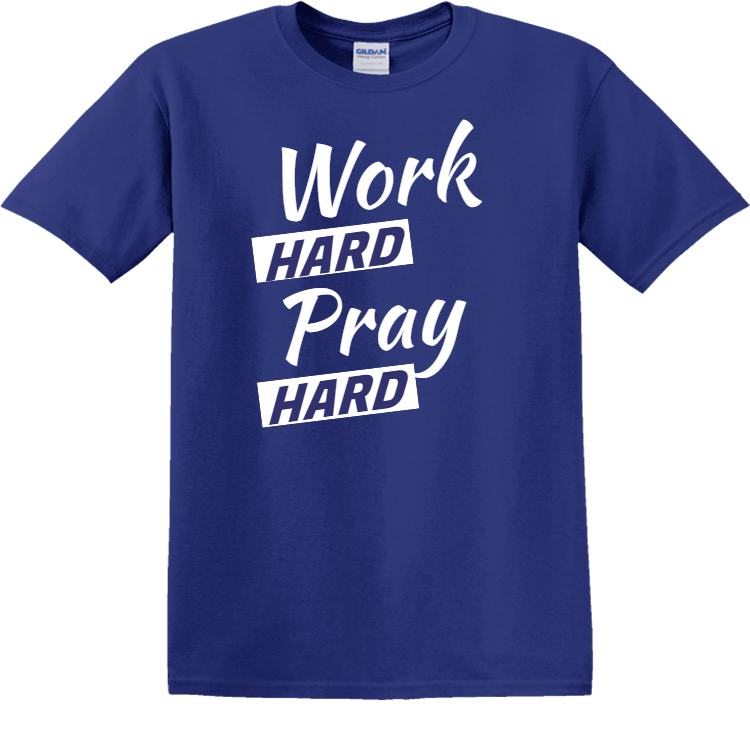 Order screen printed work hard pray hard t-shirts online. Printed christian t-shirts are perfect for your youth group event or your bible camp. Best of all, when you order with Create A Shirt, you get an easy online designer, full visibility tracking, and there are no minimum orders. This t-shirts is manufactured by gildan, and made with 100% cotton.