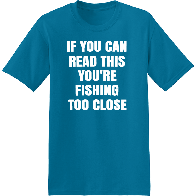 Create printed If You Can Read This You're Fishing Too Close - Fishing T-shirt Design Fishing T-Shirts Online. Screen printed Fishing T-Shirts are perfect for the winner of the fishing derby and/or commemorating the event.