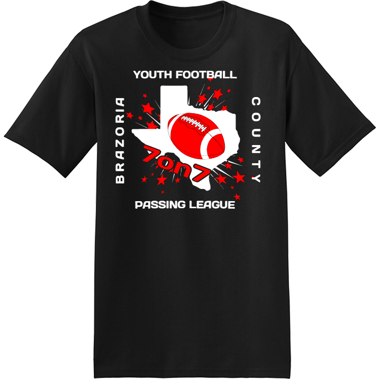 Order screen printed Youth 7on7 Football T-shirts online. Printed 7on7 football t-shirts are great for your high school tournament or club tournament. Best of all, when you order with Create A Shirt, you get an easy online designer, full visibility tracking, and there are no minimum orders. This t-shirts is manufactured by hanes, and made with 50/50 cotton/poly.