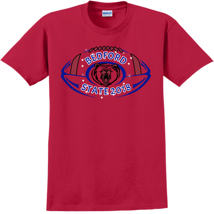 Order screen printed bedford state 2018 t shirts online. Printed T-Shirts are a great way to show your team spirit or create camaraderie. Best of all, when you order with Create A Shirt, you get an easy online designer, full visibility tracking, and there are no minimum orders. This Adult T-Shirt is manufactured by Gildan, is made with 100% Cotton.
