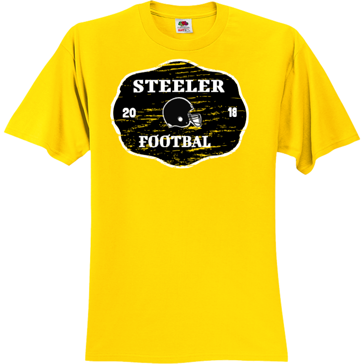 Create custom printed steeler football t-shirt online. Screen printed football t-shirts are a great way everyday and work wear. Best of all, when you order with Create A Shirt, you get free artwork help , full visibility tracking, and you can order a sample. This Adult T-Shirt is manufactured by Fruit Of The Loom, and is made with 100% 5-ounce Cotton.