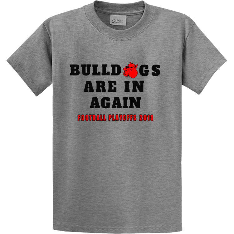 Design your own custom printed t-shirts online. Custom printed tees are great for family reunions, team outings or just everyday wear. When you order with Custom Planet, you have access to thousands of templates t-shirt designs to get those creative juices flowing. Each one if fully editable. You can change the text, colors, & fonts making them a completely new design.  Every order comes with full visibility tracking and free artwork help.  This Adult Bulldogs Are In Again T Shirts, manufactured by Gildan, is a heavy cotton t-shirt.