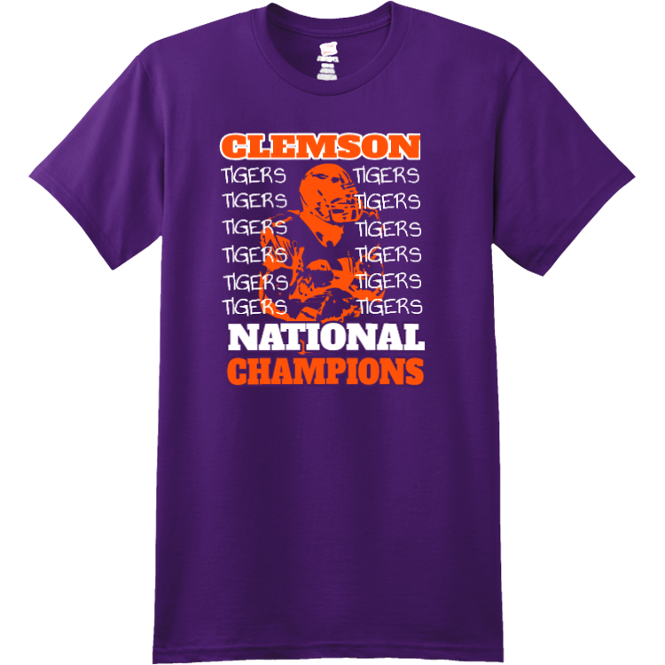 Design your own custom printed t-shirts online. Custom printed tees are great for family reunions, team outings or just everyday wear. When you order with Custom Planet, you have access to thousands of templates t-shirt designs to get those creative juices flowing. Each one if fully editable. You can change the text, colors, & fonts making them a completely new design.  Every order comes with full visibility tracking and free artwork help.  This Adult Clemson Tigers T Shirts, manufactured by Gildan, is a heavy cotton t-shirt.