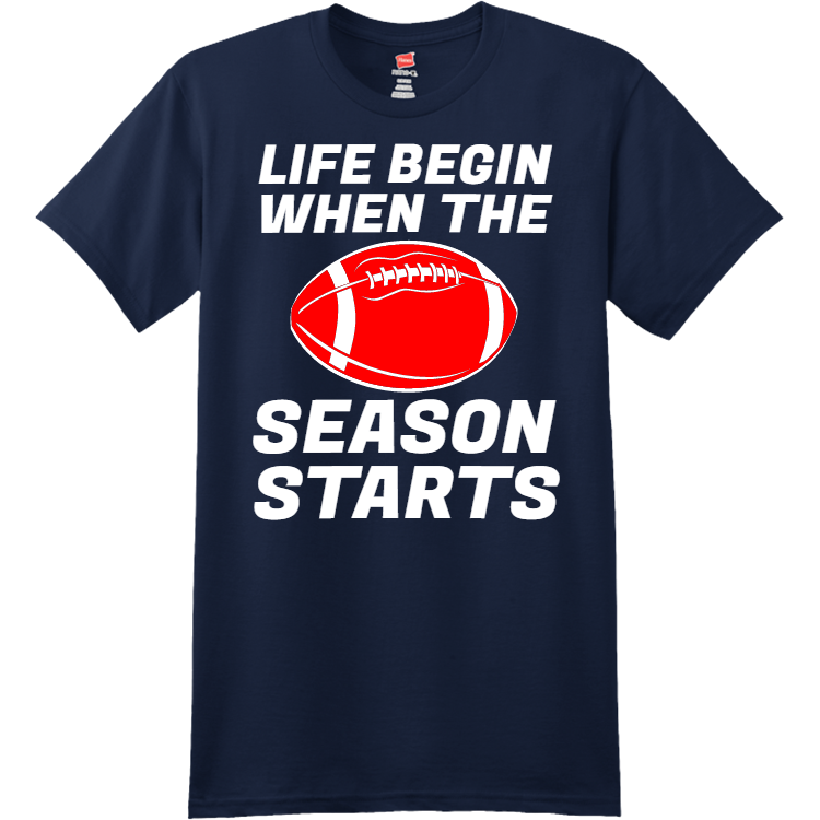 Order screen printed life begin when the season starts t-shirts online. Printed fanwear t-shirts or . Best of all, when you order with Create A Shirt, you get an easy online designer, full visibility tracking, and there are no minimum orders. This t-shirts is manufactured by hanes, and made with 100% cotton.