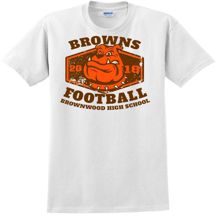 Order screen printed browns 18 20 football brownwood high school t-shirts online. Printed teamwear t-shirts are great to show your school spirit or represent your school. Best of all, when you order with Create A Shirt, you get an easy online designer, full visibility tracking, and there are no minimum orders. This t-shirts is manufactured by gildan, and made with 100% cotton.