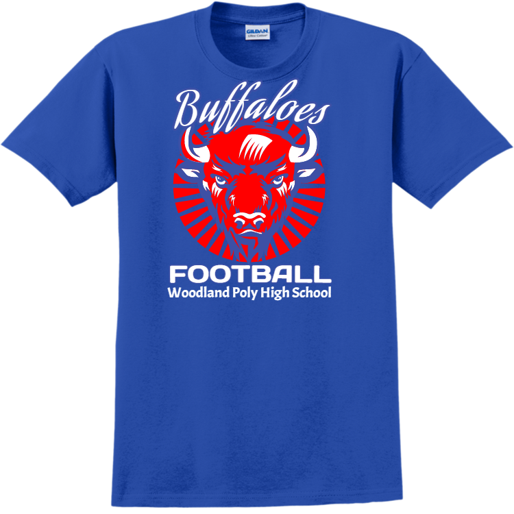Order screen printed buffaloes football woodland poly high school t-shirts online. Printed teamwear t-shirts are great to represent your school or show your school spirit. Best of all, when you order with Create A Shirt, you get an easy online designer, full visibility tracking, and there are no minimum orders. This t-shirts is manufactured by gildan, and made with 100% cotton.