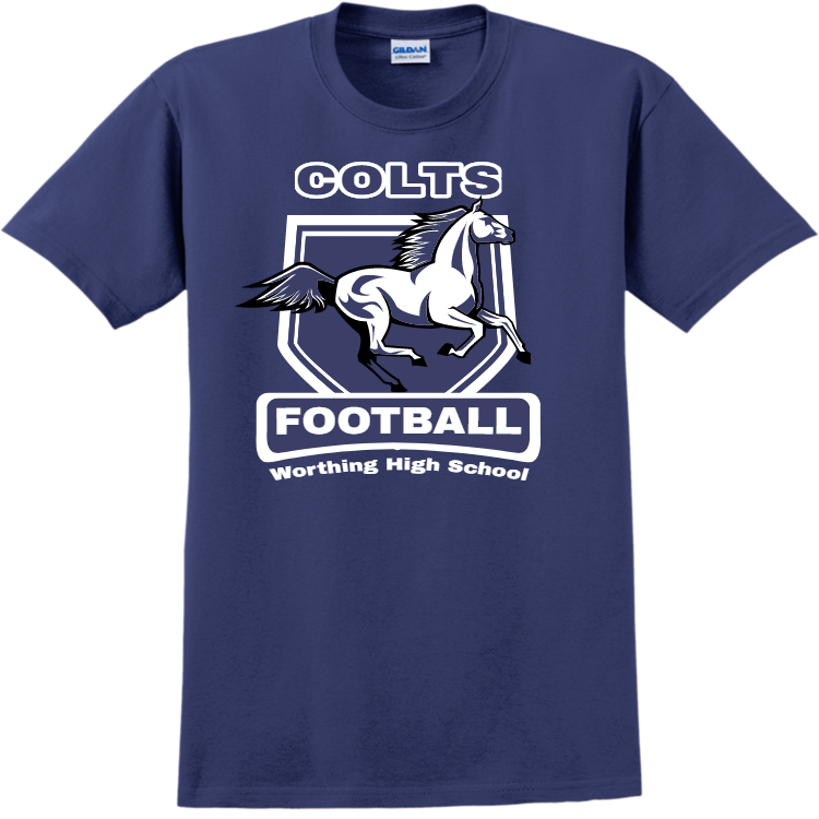 Order screen printed colts football worthing high school t-shirts online. Printed teamwear t-shirts are great to represent your school or show your school spirit. Best of all, when you order with Create A Shirt, you get an easy online designer, full visibility tracking, and there are no minimum orders. This t-shirts is manufactured by gildan, and made with 100% cotton.