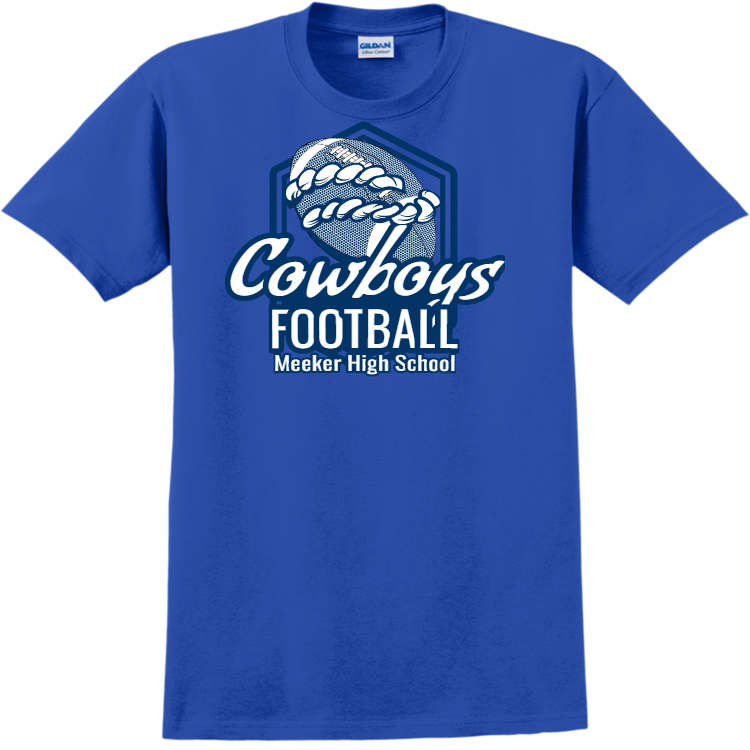 Order screen printed cowboys football meeker high school t-shirts online. Printed teamwear t-shirts are great to show your school spirit or wear after the championship game. Best of all, when you order with Create A Shirt, you get an easy online designer, full visibility tracking, and there are no minimum orders. This t-shirts is manufactured by gildan, and made with 100% cotton.