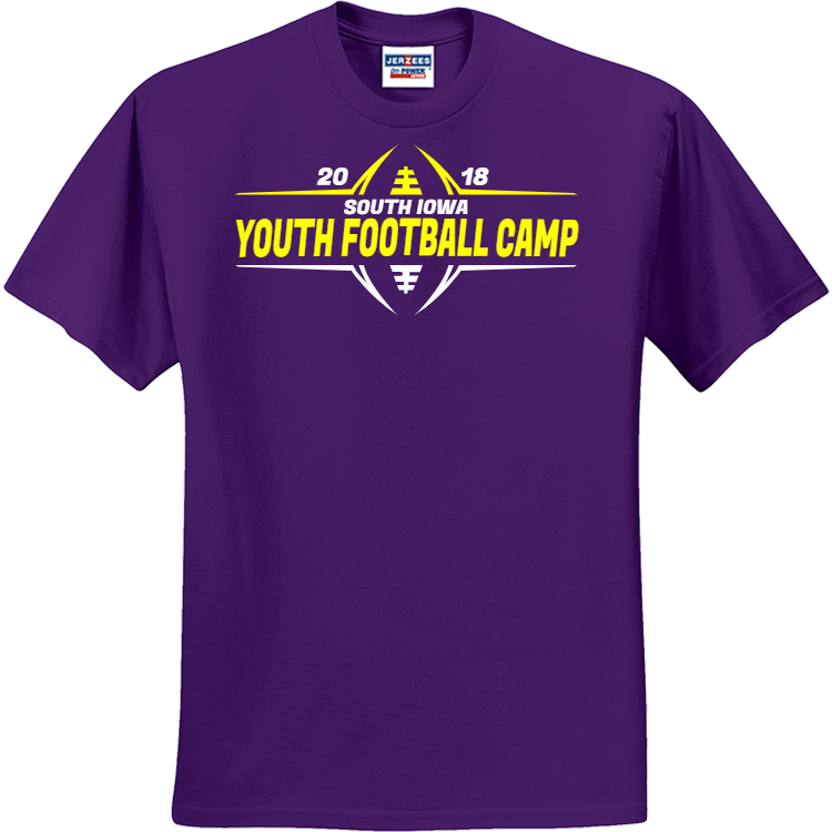 Order screen printed football camp T-shirts online. Printed teamwear t-shirts are great to wear after the championship game or represent your school. Best of all, when you order with Create A Shirt, you get an easy online designer, full visibility tracking, and there are no minimum orders. This t-shirts is manufactured by jerzees, and made with 50/50 cotton/poly.