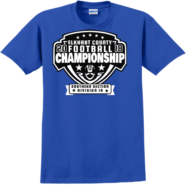Order screen printed elkhart county football championship 20 18 southern section division 1a t-shirts online. Printed teamwear t-shirts are great to show your school spirit or wear after the championship game. Best of all, when you order with Create A Shirt, you get an easy online designer, full visibility tracking, and there are no minimum orders. This t-shirts is manufactured by gildan, and made with 100% cotton.