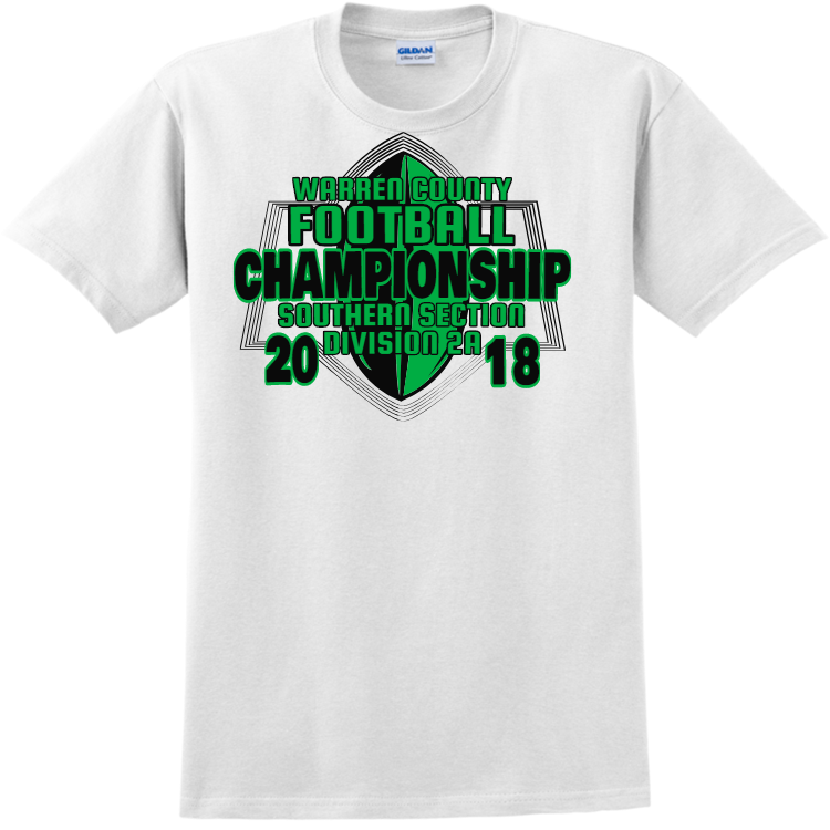 Order screen printed warren county football championship southern section division 2a 20 18 t-shirts online. Printed teamwear t-shirts are great to show your school spirit or wear after the championship game. Best of all, when you order with Create A Shirt, you get an easy online designer, full visibility tracking, and there are no minimum orders. This t-shirts is manufactured by gildan, and made with 100% cotton.
