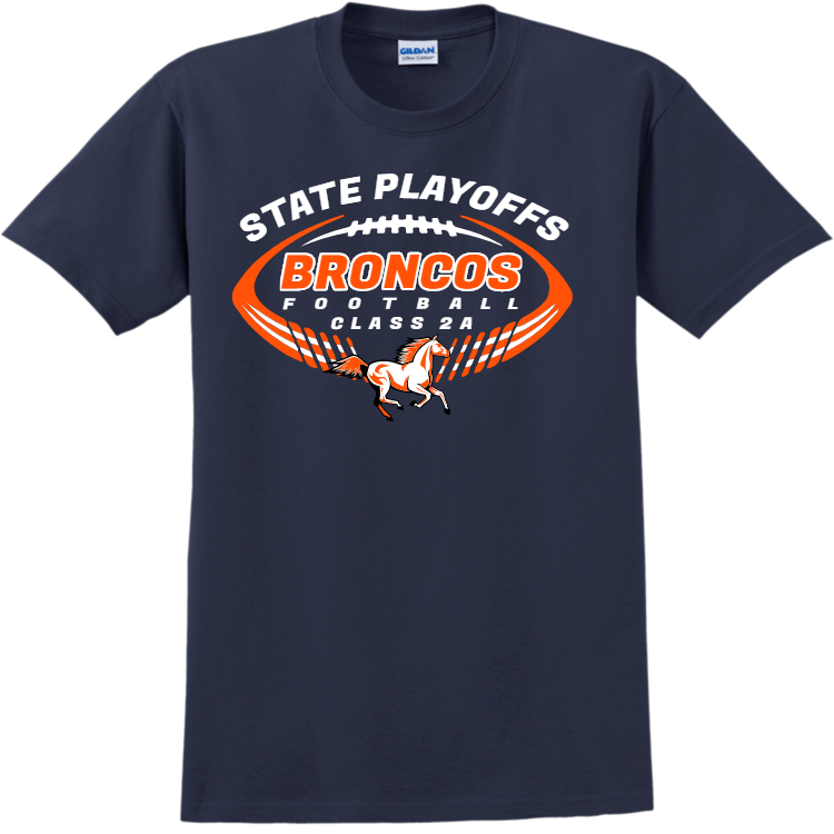 Order screen printed broncos football class 2a state playoffs t-shirts online. Printed teamwear t-shirts are great to represent your school or show your school spirit. Best of all, when you order with Create A Shirt, you get an easy online designer, full visibility tracking, and there are no minimum orders. This t-shirts is manufactured by gildan, and made with 100% cotton.