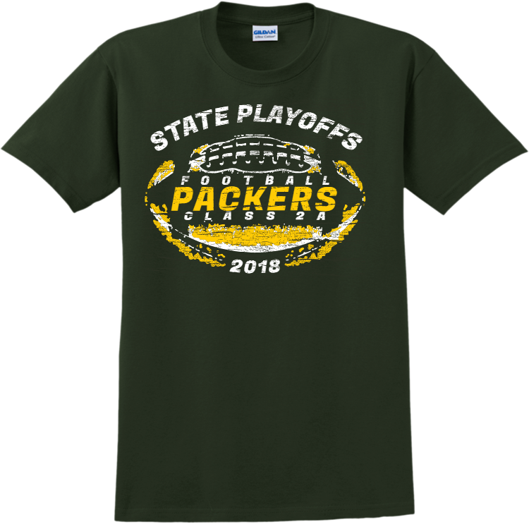 Order screen printed packers state playoffs football class 2a 2018 t-shirts online. Printed teamwear t-shirts are great to represent your school or show your school spirit. Best of all, when you order with Create A Shirt, you get an easy online designer, full visibility tracking, and there are no minimum orders. This t-shirts is manufactured by gildan, and made with 100% cotton.