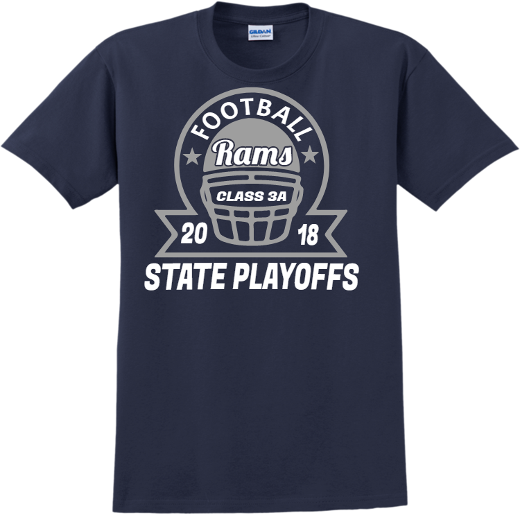 Order screen printed state playoffs football rams 18 20 class 3a t-shirts online. Printed teamwear t-shirts are great to show your school spirit or wear after the championship game. Best of all, when you order with Create A Shirt, you get an easy online designer, full visibility tracking, and there are no minimum orders. This t-shirts is manufactured by gildan, and made with 100% cotton.