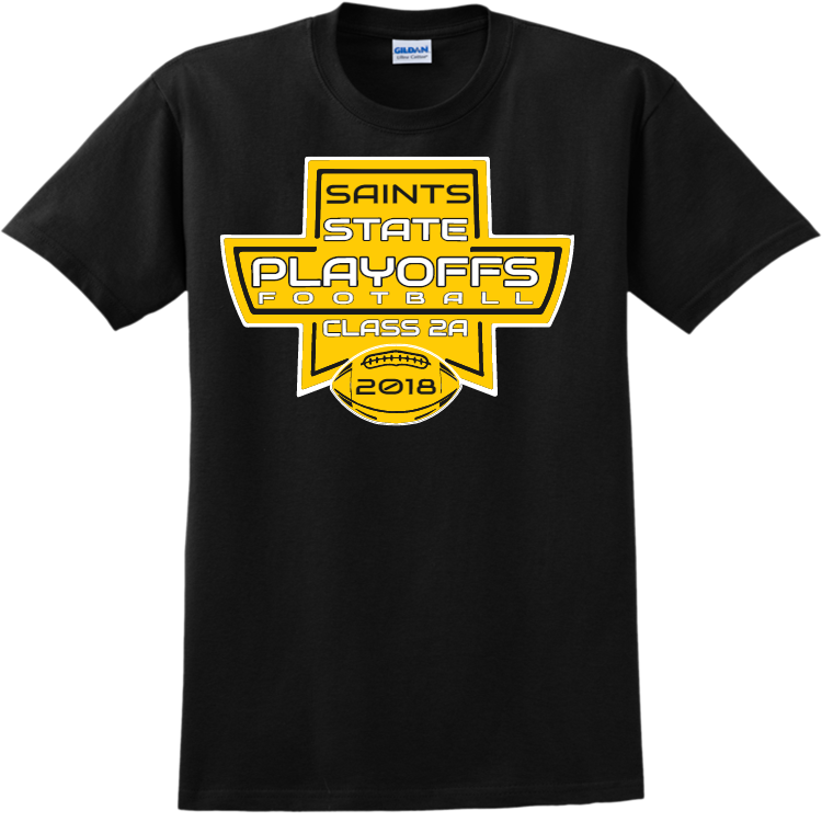 Order screen printed playoffs state football class 2a saints 2018 t-shirts online. Printed teamwear t-shirts are great to show your school spirit or represent your school. Best of all, when you order with Create A Shirt, you get an easy online designer, full visibility tracking, and there are no minimum orders. This t-shirts is manufactured by gildan, and made with 100% cotton.