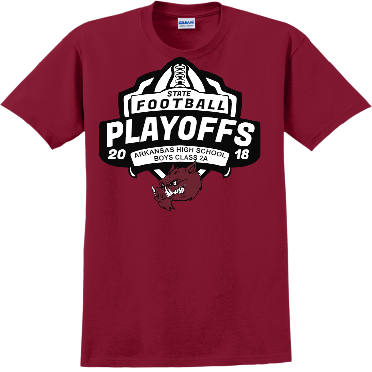 Order screen printed state arkansas high school football playoffs boys class 2a 20 18 t-shirts online. Printed teamwear t-shirts are great to show your school spirit or represent your school. Best of all, when you order with Create A Shirt, you get an easy online designer, full visibility tracking, and there are no minimum orders. This t-shirts is manufactured by gildan, and made with 100% cotton.