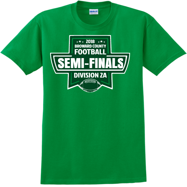 Order screen printed football semi-finals T-shirts online. Printed teamwear t-shirts are great to wear after the championship game or show your school spirit. Best of all, when you order with Create A Shirt, you get an easy online designer, full visibility tracking, and there are no minimum orders. This t-shirts is manufactured by gildan, and made with 100% cotton.
