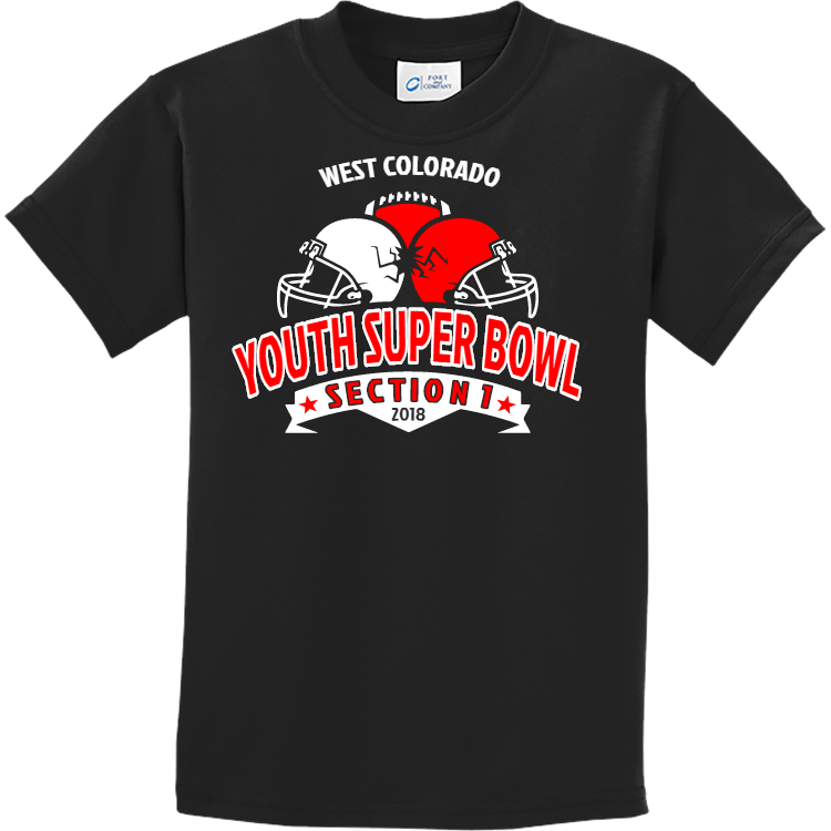 Order screen printed west colorado youth super bowl section 1 2018 t-shirts online. Printed teamwear t-shirts are great to show your school spirit or represent your school. Best of all, when you order with Create A Shirt, you get an easy online designer, full visibility tracking, and there are no minimum orders. This t-shirts is manufactured by gildan, and made with 100% cotton.