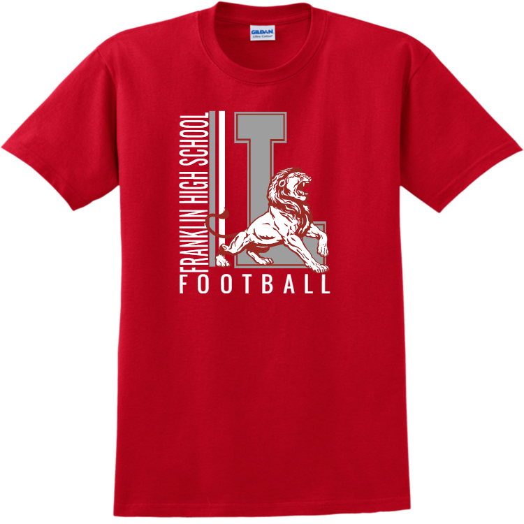 Order screen printed franklin high school football t-shirts online. Printed teamwear t-shirts are great to show your school spirit or represent your school. Best of all, when you order with Create A Shirt, you get an easy online designer, full visibility tracking, and there are no minimum orders. This t-shirts is manufactured by gildan, and made with 100% cotton.