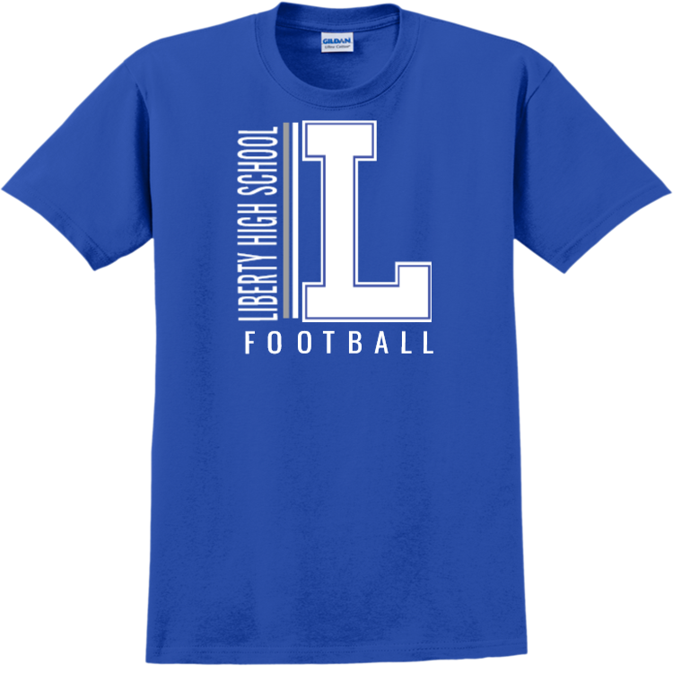 Order screen printed liberty high school football t-shirts online. Printed teamwear t-shirts are great to show your school spirit or represent your school. Best of all, when you order with Create A Shirt, you get an easy online designer, full visibility tracking, and there are no minimum orders. This t-shirts is manufactured by gildan, and made with 100% cotton.