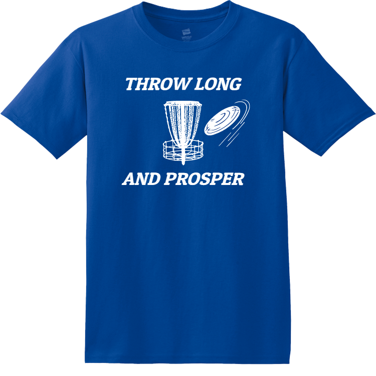 Create printed Throw Long And Prosper - Frisbee Golf T-shirt Design Frisbee Golf T-Shirts Online. Screen printed Frisbee Golf T-Shirts are definitely what to wear stand out in a crowd and let your rival know who the champions are.