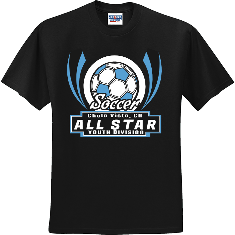 Design your own custom printed Soccer All Star Chula Vista, Ca - Soccer T-shirt Design Soccer T-Shirts Online. Screen printed Soccer T-Shirts are the best way to show them who the champs are and/or show your price.